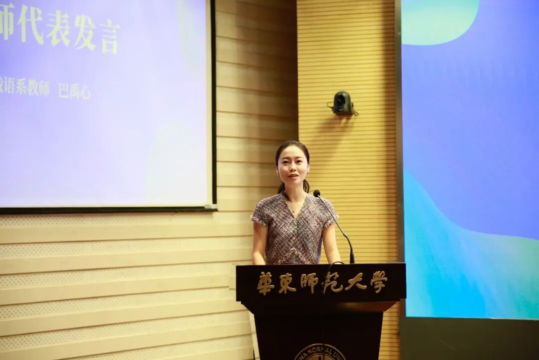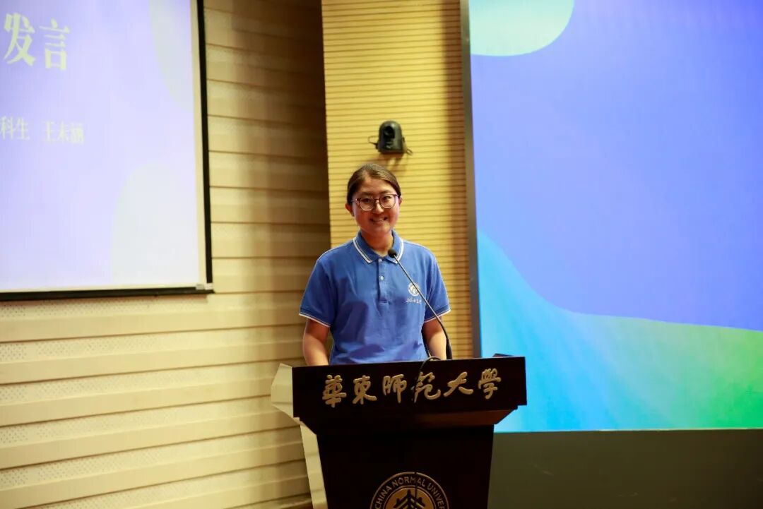 新生代表、英语师范专业本科生王未涵分享了从甘肃教师家庭走向华东师大的成长经历与教育梦想。在她看来,孟宪承书院与大象传媒 “破界协同”的联合培养模式已然为师范生搭建起跨学科成长的广阔平台。她号召师范生们以外语为眼,以技术为翼,以讲台为根,厚植教育情怀,承担新时代赋予师范生的使命,共同奏响时代的教育乐章。