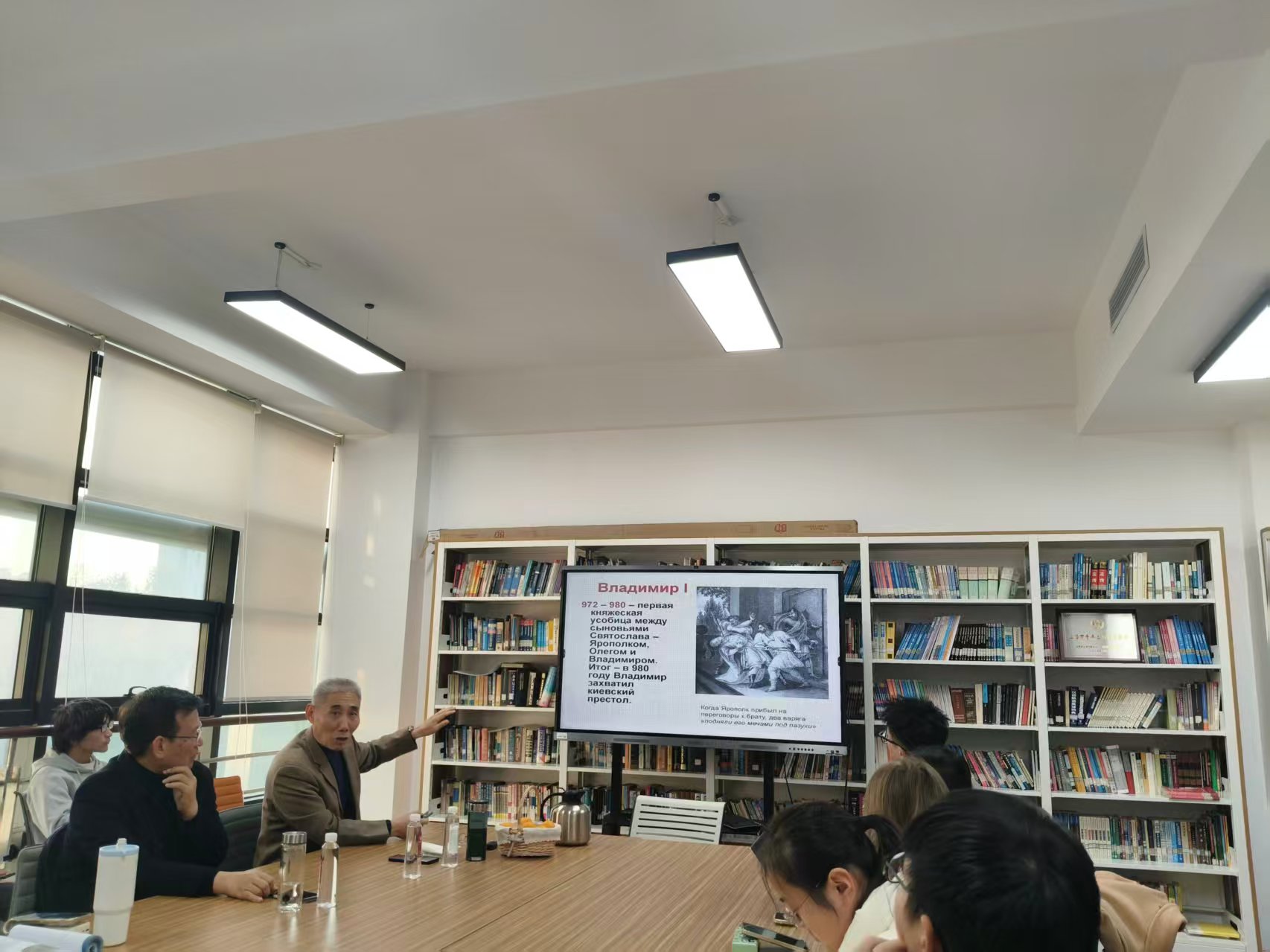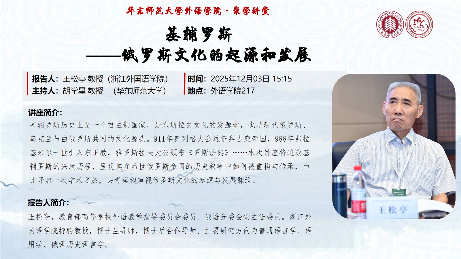 2025年12月3日下午3:00,在大象传媒 217教室举行题为“基辅罗斯——俄罗斯文化的起源和发展”的学术讲座。本次讲座由俄语系策划主办,特邀浙江外国语学院特聘教授、博士生导师、教育部高等学校外语教育指导委员会俄语分委会副主任委员王松亭教授担任主讲嘉宾。俄语系主任胡学星教授、系主任助理班婕老师、张嘉辉老师以及俄语系本科生、硕博研究生共同参加了此次活动。讲座还吸引了历史系、英语系等其他院系的师生慕名前来,现场座无虚席,学术氛围浓厚。讲座由胡学星教授主持。