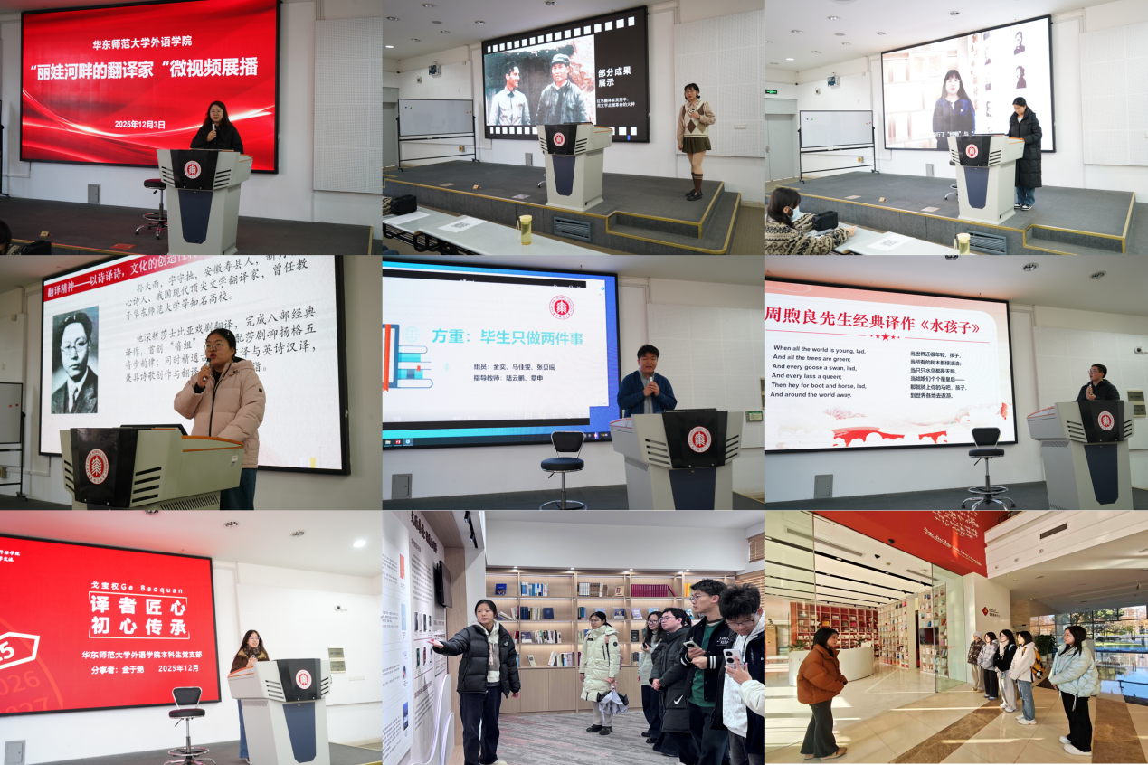 在实践教学环节,学员通过参加“丽娃河畔的翻译家”微视频展播、参观学校党建服务中心及丽娃河畔的翻译家成果陈列室三个环节,将党史校史学习与专业教育深度融合。
