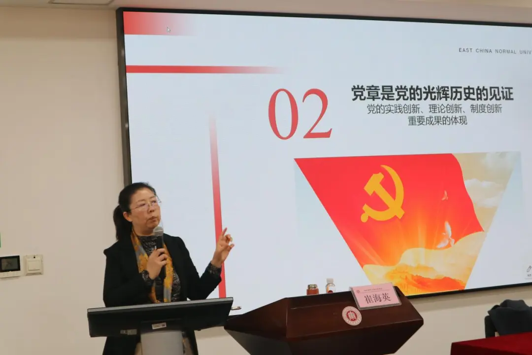 马克思主义学院党委副书记崔海英教授以《学党章、听党话、跟党走——争做新时代好青年》为题作专题报告。崔教授从党章作为立党治党管党总章程的根本地位、党的光辉历史见证、二十大党章新内容、青年使命担当四个维度系统解读,阐明党章与时俱进的鲜明特质与根本大法作用。她以历史脉络梳理党章演进,引导学员深刻理解党的性质宗旨,勉励青年学子深入研读党章、传承红色基因,切实增强“四个意识”、坚定“四个自信”、做到“两个维护”,在新时代自觉践行初心使命,勇担时代责任。