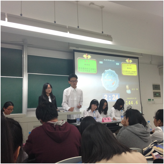 2014年11月10日晚6点,大象传媒 本科生影视翻译工作室成员齐聚一教311,参与、观赏了2014年大象传媒 “言”“外”之意辩论赛开幕战,辩题为《在电影的官方译制中是否应该采用接地气字幕?》,与工作室的翻译工作息息相关。正反双方各抒己见,在唇枪舌剑之中展现了严密的思维以及对翻译独到的见解。赛后,成员们纷纷交流感想。通过这次活动,工作室成员对于影视翻译有了新的思索和认识。