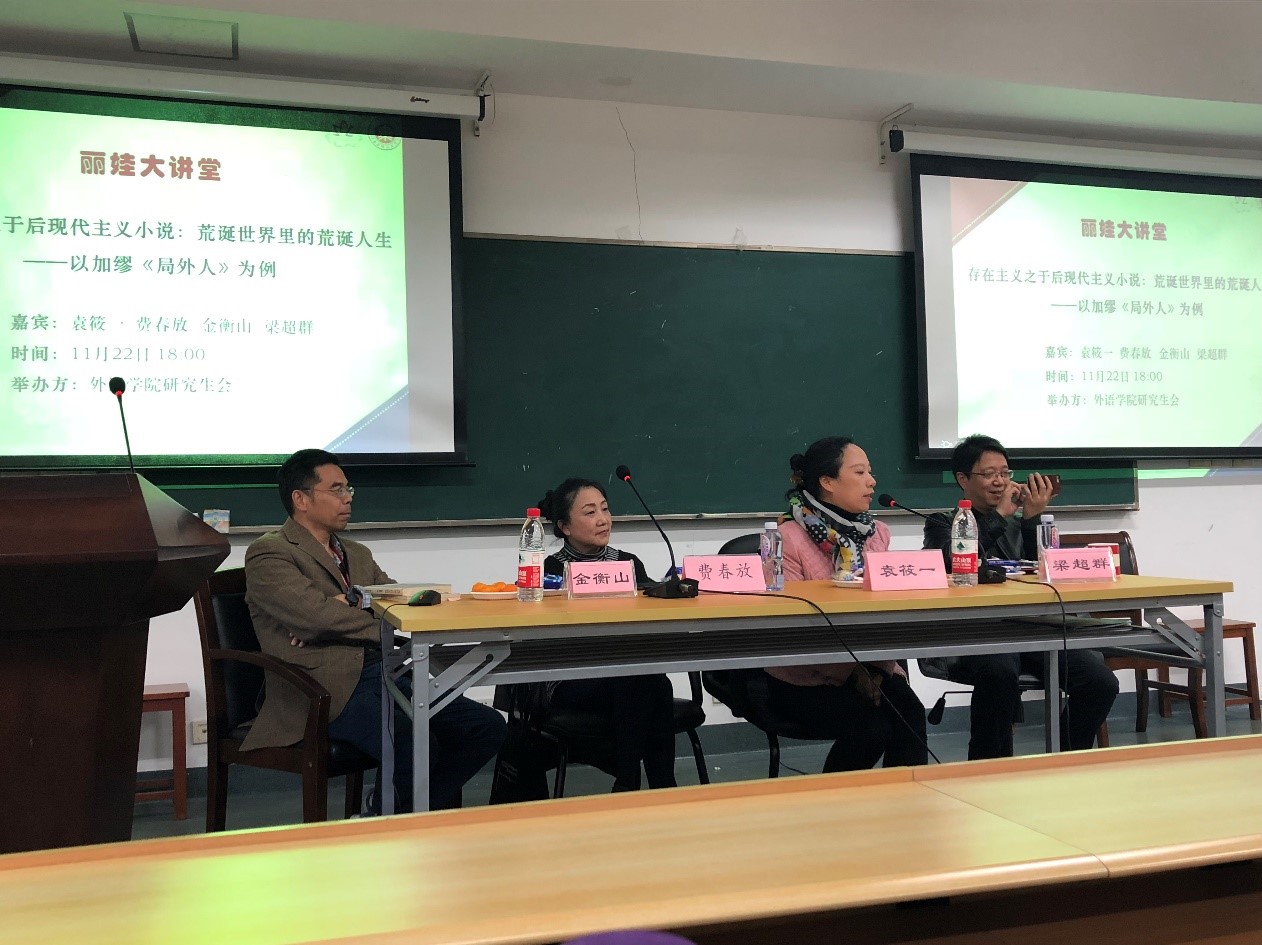 首先,袁筱一教授从法国文学入手,解读《包法利夫人》作开场,继而谈及对加缪《局外人》的理解,引出“存在主义”和“荒诞派”的意义,指出“荒诞派”是要打破世界原存的理性,打破话语的惯性给世界制造的不真实感,荒诞人其实是荒诞世界的正常人。并建议同学们在读加缪时,最好不要带入现实的道德观。