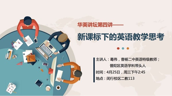 4月25日,英语系华英讲坛第四讲开讲。曹杨二中英语特级教师、普陀区英语学科带头人葛伟老师给大家做了题为“新课标下的英语教学思考”的讲座。